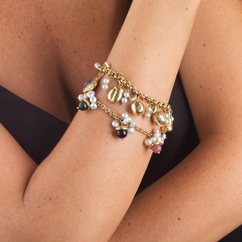 DUE BRACCIALI A CATENA CON PENDENTI in oro giallo 18kt, di cui uno con catena a maglia rollò da cui pendono ciondoli di varie forme e coppie di perle di mm 5 circa, e un secondo bracciale con ciondoli a forma di ghiande impreziosito da pietre semipreziose e perle di fiume, punzoni 750 e del fabbriante, chiusura a moschettone, lungh. cm 19,5, gr. 63 complessivi