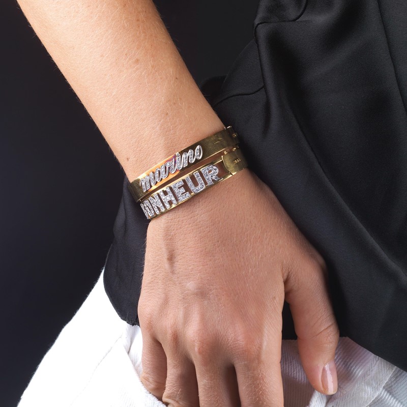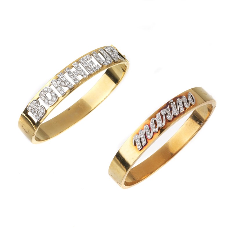 DUE BRACCIALI RIGIDI CON DIAMANTI in oro giallo e bianco 18kt, di cui uno recante la scritta "Bonheur" e il secondo con la scritta "Marino", impreziositi da diamanti taglio huit huit per ct 1.70 circa, punzone 750, dim. cm 6x5, diam. interno cm 5,5, gr. 59 complessivi
