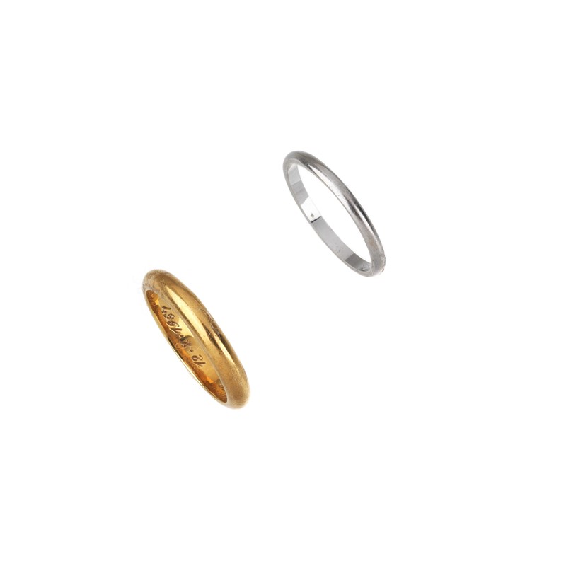 un anello in oro giallo 18kt, mis. 52, accompagnato da un secondo anello in oro bianco 18kt, mis. 51, punzoni 750 e del fabbricante, gr. 5 complessivi