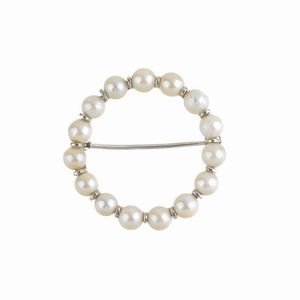 SPILLA A CERCHIO CON PERLE in oro bianco 18kt, composta da una fila di perle di mm 4 circa, punzone 750, dim. [..]