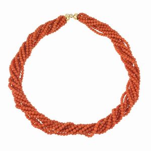 COLLANA IN CORALLO TORCHON composta da nove fili di piccole sfere in corallo di mm 2 circa, fermatura in oro giallo [..]