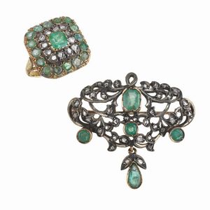 SPILLA E ANELLO CON SMERALDI E DIAMANTI in oro e argento, anello impreziosito da smeraldi taglio rotondo e rose [..]