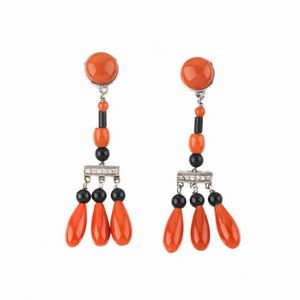 PAIO DI ORECCHINI PENDENTI CON CORALLO ONICE E DIAMANTI in oro bianco 18kt, composti da gocce, barilotti e bottoni [..]