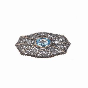 PICCOLA SPILLA CON QUARZO BLU in oro giallo e bianco 18kt, al centro un quarzo blu taglio a goccia di ct 4.30 [..]