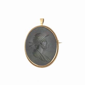 SPILLA/PENDENTE CON DIASPRO SANGUIGNO composta da cammeo in diaspro sanguigno raffigurante un profilo maschile [..]
