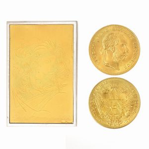 CORONA AUSTROUNGARICA CON PIASTRINA FIGURATA moneta in oro, diam. mm 19, accompagnata da una piastrina composta [..]
