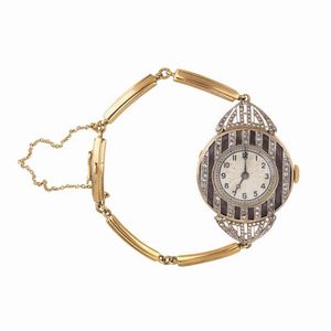 OROLOGIO DA DONNA cassa a cerniera in oro e argento, lunetta decorata in smalto viola e impreziosita da file [..]