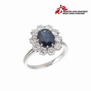 ANELLO A MARGHERITA CON ZAFFIRO E DIAMANTI in oro bianco 18kt, al centro uno zaffiro taglio ovale di ct 1.40 circa, [..]