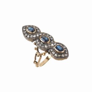 ANELLO A LOSANGA CON ZAFFIRI E DIAMANTI in argento e oro, impreziosito da tre zaffiri taglio ovale per ct 1.50 [..]