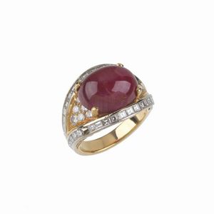 ANELLO A FASCIA CON RUBINO E DIAMANTI in oro giallo e bianco 18kt, al centro un rubino taglio ovale di ct 0.60 [..]