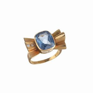 ANELLO A FORMA DI FIOCCO CON QUARZO BLU E DIAMANTI in oro a basso titolo, al centro un quarzo blu taglio cuscino [..]