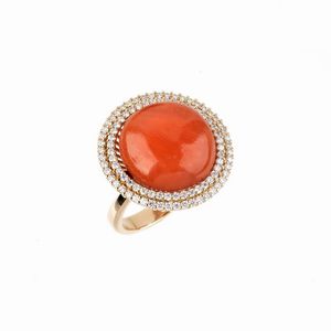 ANELLO CON CORALLO E DIAMANTI in oro giallo 18kt, al centro un bottone in corallo di mm 16x9 circa, circondato [..]