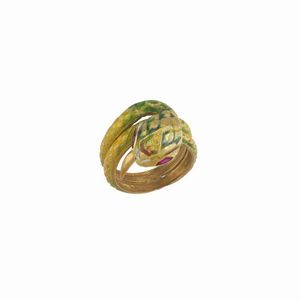 ANELLO A FORMA DI SERPENTE in oro giallo 18kt, decorato in smalti e impreziosito da due rubini sfaccettati, punzone [..]