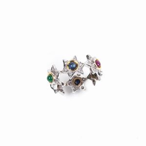 ANELLO A FASCIA CON PIETRE DI COLORE E DIAMANTI in oro bianco e giallo 18kt, con una serie di stelle concatenate [..]