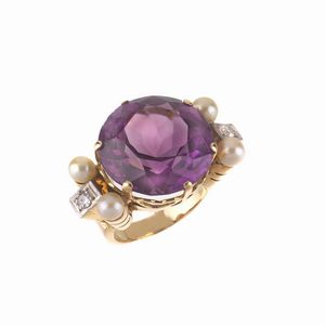 ANELLO CON AMETISTA PERLE E DIAMANTI in oro giallo e bianco 18kt, con al centro un'ametista taglio rotondo di [..]