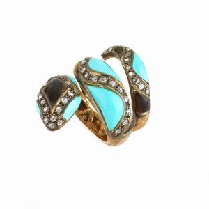 ANELLO A SERPE CON PIETRE DURE E DIAMANTI in oro e argento, con intarsi in turchese e pietre dure, impreziosito [..]