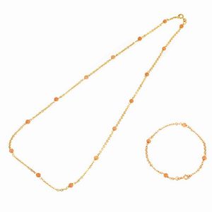 COLLANA E BRACCIALE CON CORALLI in oro giallo 18kt, realizzati a catena con piccole sfere in corallo di mm 4 circa, [..]