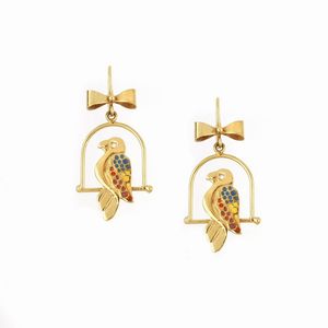 PAIO DI ORECCHINI A FORMA DI UCCELLINI SU POSATOIO in oro giallo 18kt, decorati in smalto, punzone 750, dim. cm [..]