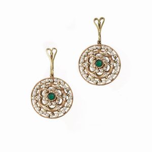 PAIO DI ORECCHINI A DISCO CON SMERALDI E MICROPERLE in oro giallo 18kt e oro a basso titolo, di forma circolare, [..]