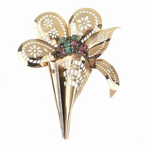 GRANDE SPILLA A MAZZO FIORITO CON PIETRE DI COLORE E DIAMANTI in oro a basso titolo, lavorata a traforo, impreziosita [..]