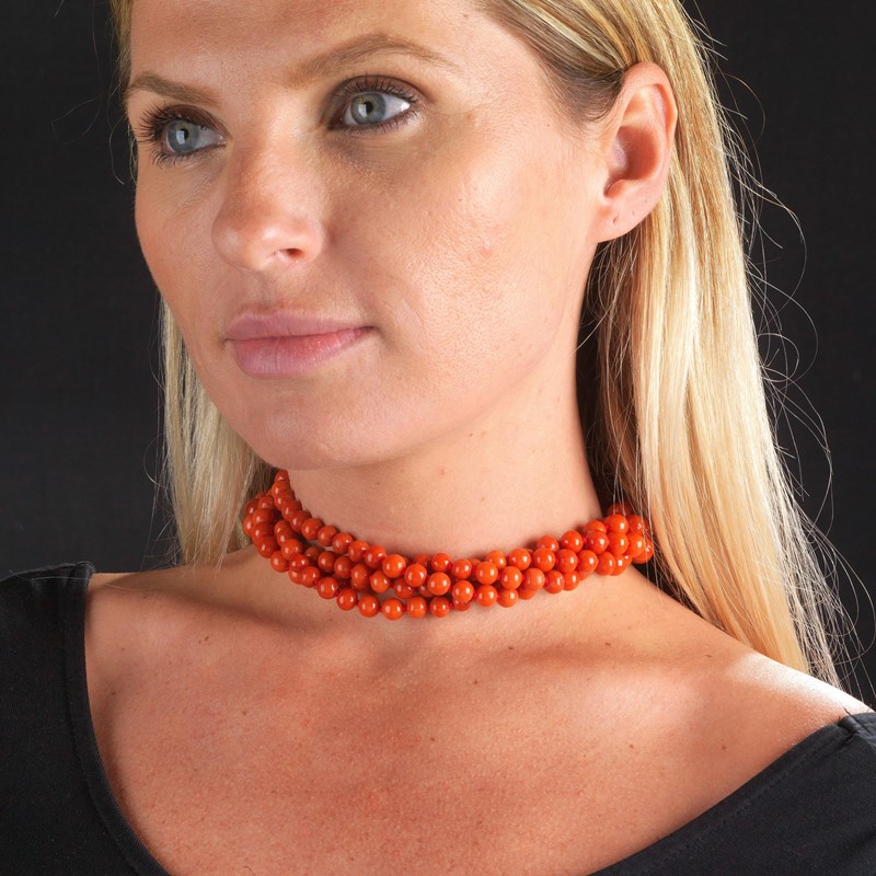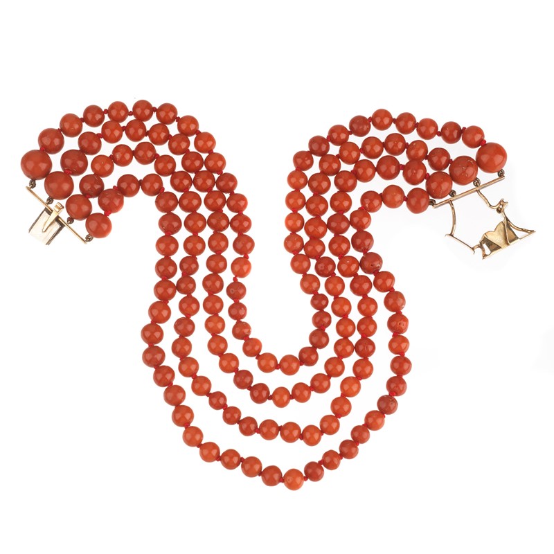 composto da quattro fili di sfere in corallo digradanti di mm 11-7 circa, fermatura in oro giallo 18kt, lungh. cm 37, gr. 130