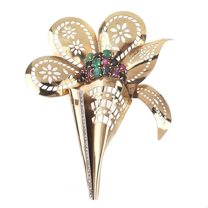 GRANDE SPILLA A MAZZO FIORITO CON PIETRE DI COLORE E DIAMANTI in oro a basso titolo, lavorata a traforo, impreziosita da zaffiri, rubini e smeraldi taglio ovale per ct 5.40 circa, e da diamanti taglio huit huit per ct 0.30 circa, dim. cm 8x11,5, gr. 29
