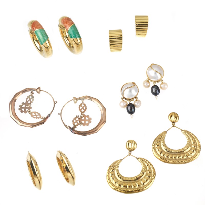 LOTTO COMPOSTO DA SEI PAIA DI ORECCHINI in oro giallo 18kt e oro a basso titolo, di cui tre orecchini a cerchio, un paio di orecchini stile archeologico, un paio con superficie scanalata e un paio di orecchini con perle bianche e grigie, gr. 88 complessivi