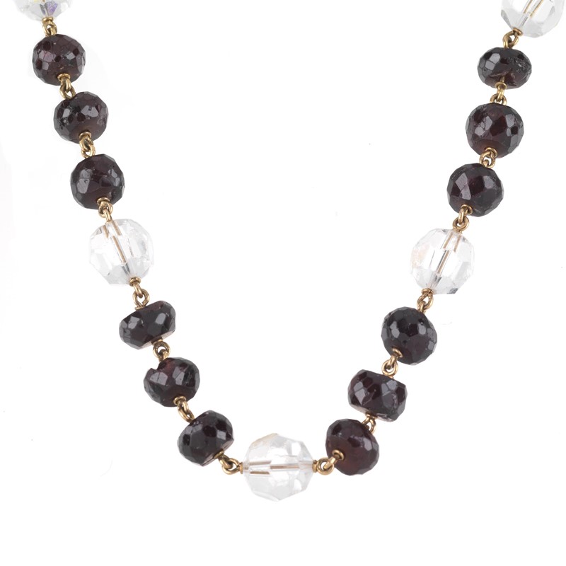 ad un filo di granati sfaccettati (difetti), alternati a sfere sfaccettate in cristallo di mm 11 circa, lungh. cm 144, gr. 229