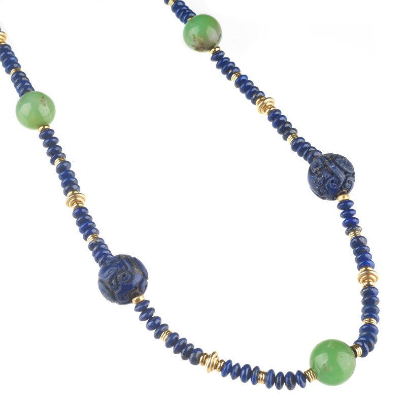 LUNGA COLLANA IN LAPISLAZZULI E GIADA composta da una serie di dischi in lapislazzuli intervallati da grandi sfere digradanti di mm 21-18 circa in giada e lapislazzuli inciso, fermatura e distanziali in oro giallo 18kt, punzone 750, lungh. cm 103, gr. 178
