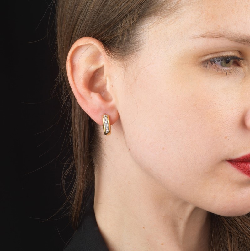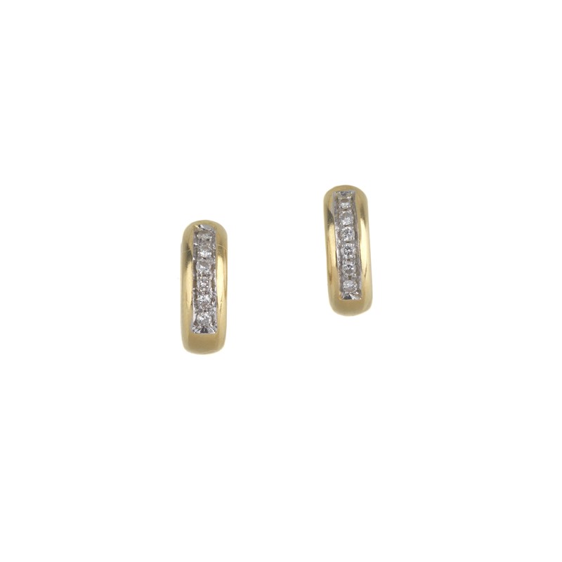 in oro giallo e bianco 18kt, impreziositi da diamanti taglio brillante per ct 0.10 circa, punzoni 750 e del fabbricante, dim. cm 0,5x1,5, gr. 6 complessivi