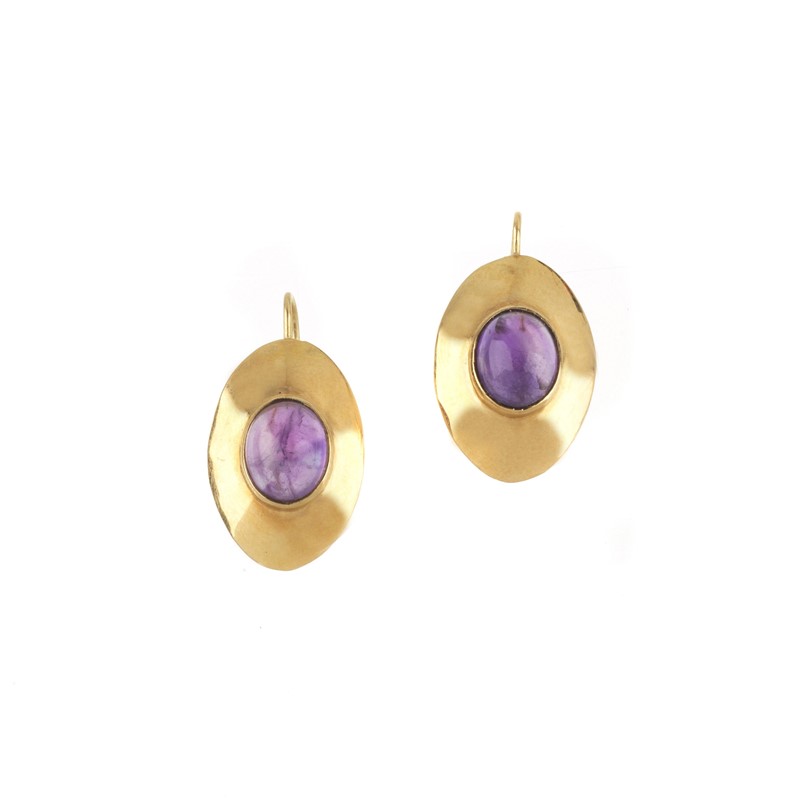 in oro giallo 18kt, al centro due ametiste taglio cabochon per ct 4 circa, punzoni 750 e del fabbricante, dim. cm 1,5x3, gr. 6 complessivi