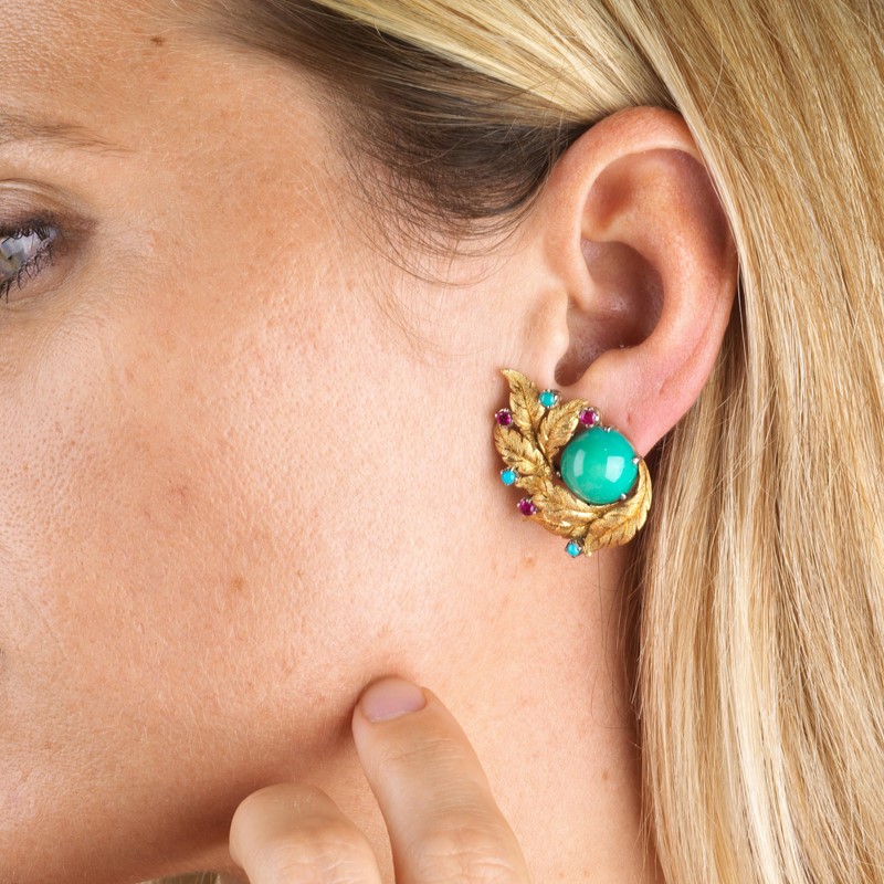 PAIO DI ORECCHINI A TRALCI CON TURCHESI E RUBINI in oro giallo e bianco satinato 18kt, al centro due turchesi taglio cabochon di mm 12x6 circa avvolti da tralci impreziositi da rubini taglio rotondo per ct 0.30 circa e sfere in pasta di turchese, punzoni 750 e del fabbricante, dim. cm 2,5x3,5, chiusura a clip con perno, gr. 18 complessivi