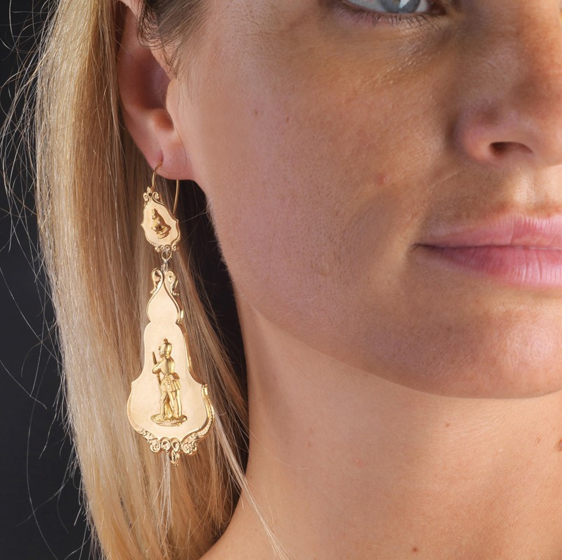 in oro giallo 18kt, realizzati in lamina sottile e raffiguranti al centro un soldato a rilievo, dim. cm 3x9, chiusura a monachella, gr. 9 complessivi