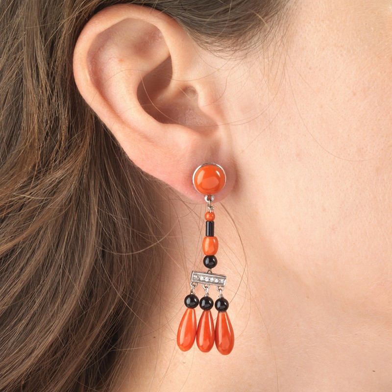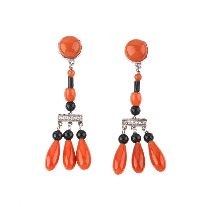 PAIO DI ORECCHINI PENDENTI CON CORALLO ONICE E DIAMANTI