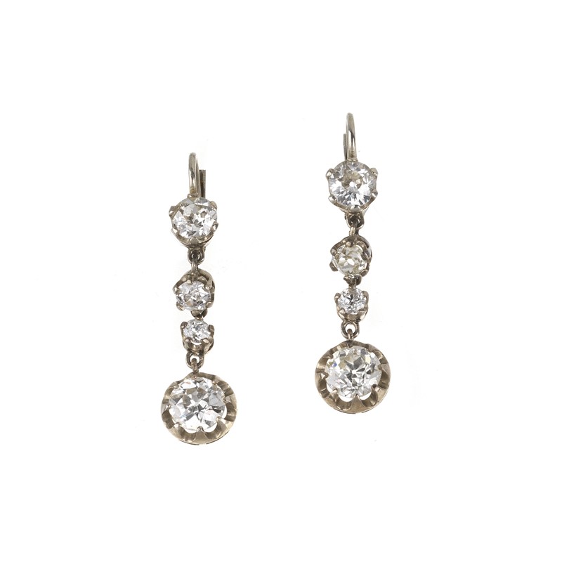 in oro bianco 18kt, impreziositi da diamanti taglio vecchio per ct 3 circa, punzoni 750 e del fabbricante, lungh. cm 3,5, chiusura a monachella, gr. 4 complessivi