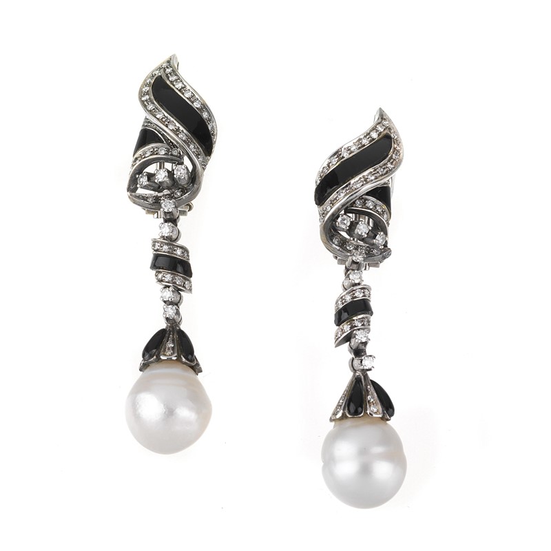 PAIO DI ORECCHINI PENDENTI CON PERLE ONICE E DIAMANTI in oro bianco 18kt, impreziositi da diamanti taglio huit huit per ct 1.30 circa e intarsi in onice, da cui pendono due perle di mm 13 circa, punzoni 750 e del fabbricante, dim. cm 1,5x6, chiusura a clip con perno, gr. 25 complessivi