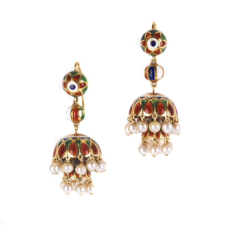 in oro giallo 18kt, decorati in smalti policromi, composti da elementi a campana da cui pendono perle di mm 4 circa, punzone 750, dim. cm 2x4 circa, chiusura a gancio, gr. 28 complessivi