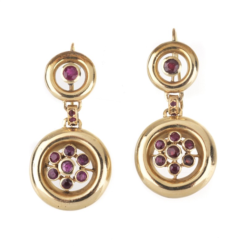 in oro a basso titolo, impreziositi da rubini taglio rotondo (uno mancante) per ct 2 circa, punzone 500, dim. cm 2x4,5, gr. 14 complessivi