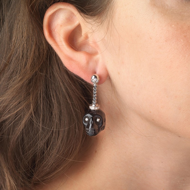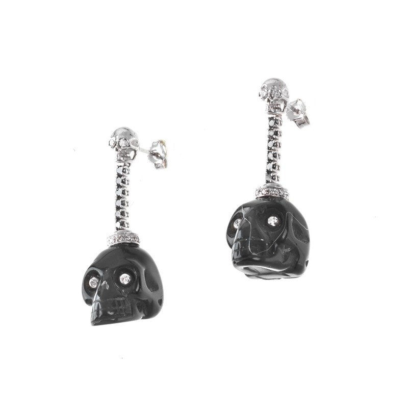 SKULL DROP EARRINGS IN 18KT WHITE GOLD AND ONYX