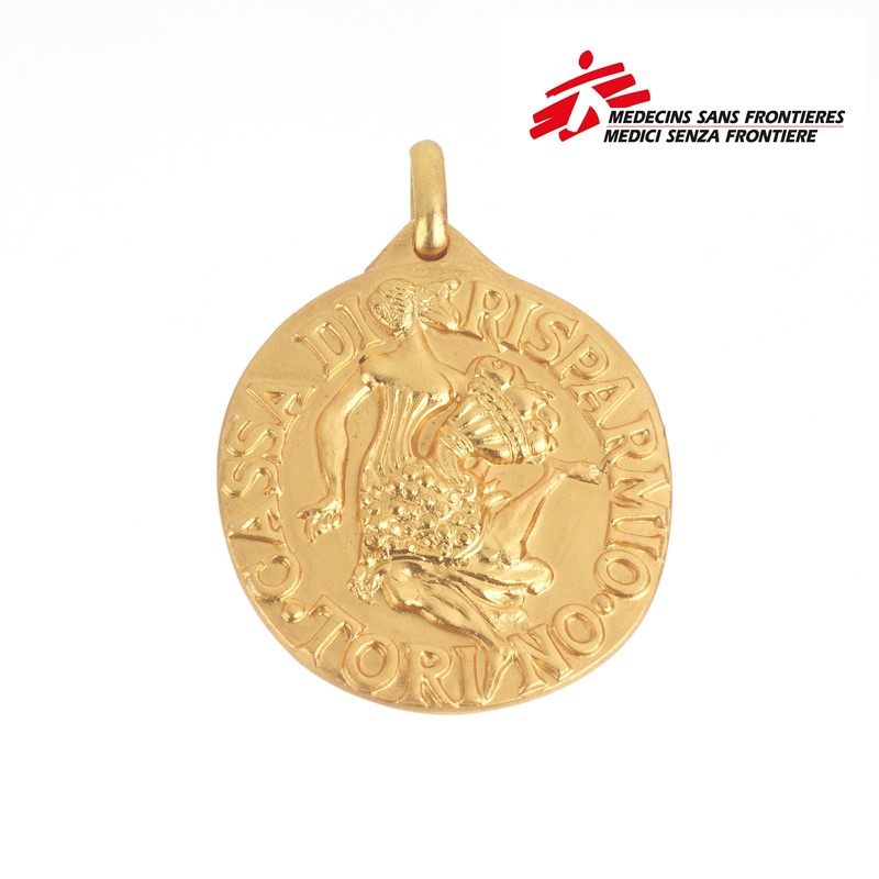 PENDENTE in oro giallo 18kt, con motivi figurati a rilievo sul fronte e sul retro e la scritta "Cassa di Risparmio Torino", punzoni 750 e del fabbricante, dim. cm 2,5x3,5, gr. 14