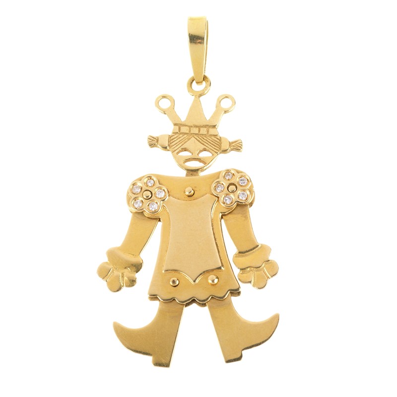 in oro giallo 18kt, raffigurate una regina stilizzata dagli arti pieghevoli, impreziosito da diamanti taglio huit huit per ct 0.10 circa, punzoni 750 e del fabbricante, dim. cm 2,5x5,5, gr. 9