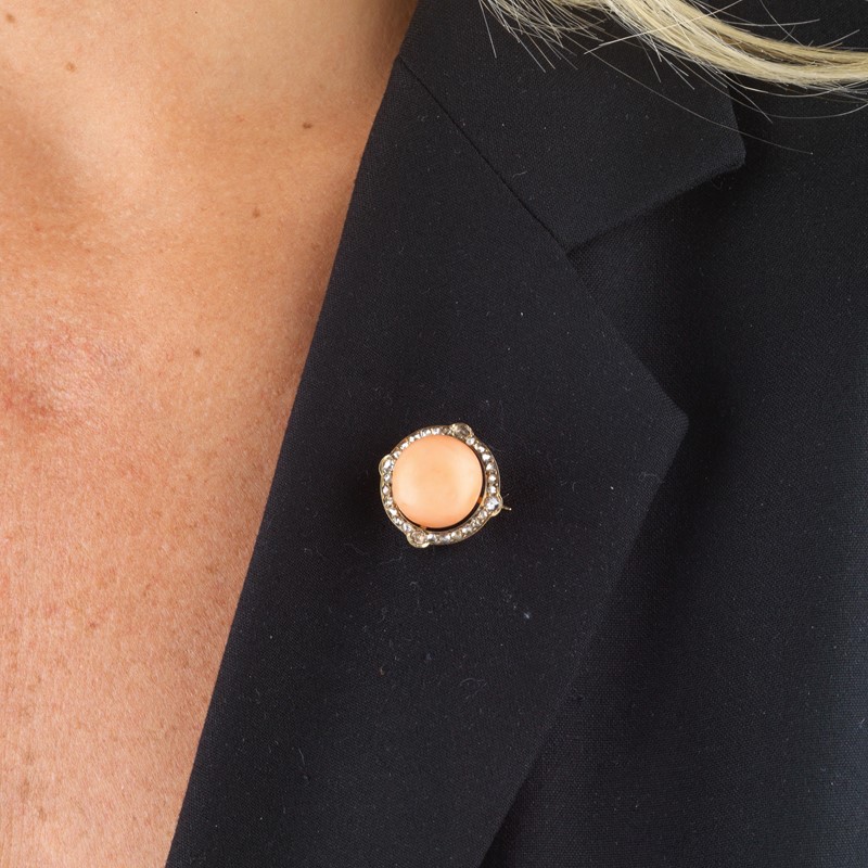 SMALL CORAL AND DIAMOND BROOCH IN 18KT YELLOW GOLD
