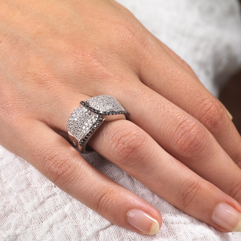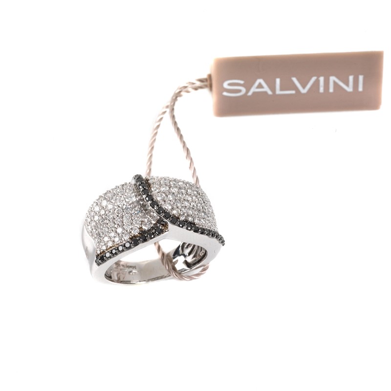 in oro bianco 18kt, impreziosito da pavé di diamanti taglio brillante per ct 1.30 circa cinti da una fila di diamanti neri taglio brillante, firmato "Salvini",punzoni 750 e del fabbricante, mis. 54, gr. 11