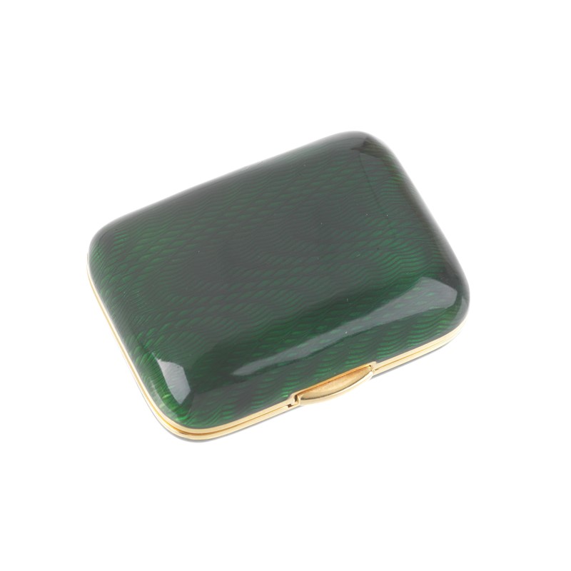 in oro giallo 18kt e rivestito in smalto verde, punzoni 750 e del fabbrcante, dim. cm 2,5x3,5x1 circa, gr. 42