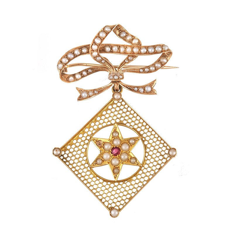 RIBBON BROOCH WITH A PENDANT IN GOLD