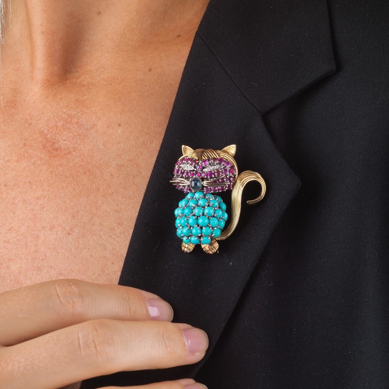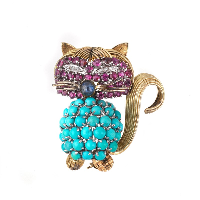 SPILLA A FORMA DI GATTO CON TURCHESI PIETRE DI COLORE E DIAMANTI