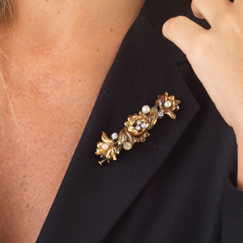 PEARL AND DIAMOND CLUSTER BROOCH IN 14KT GOLD