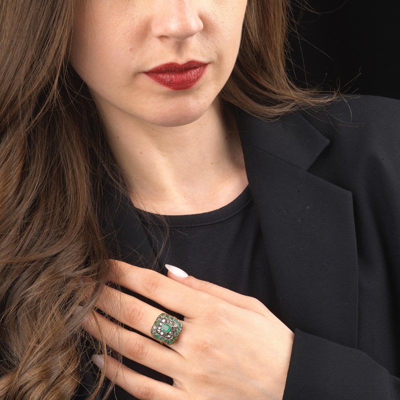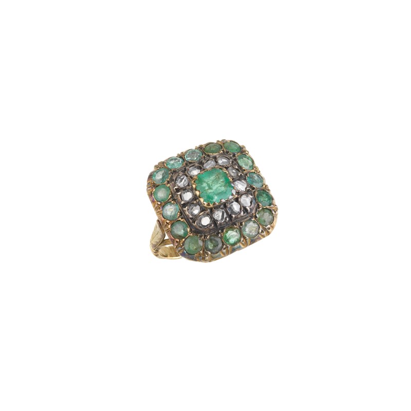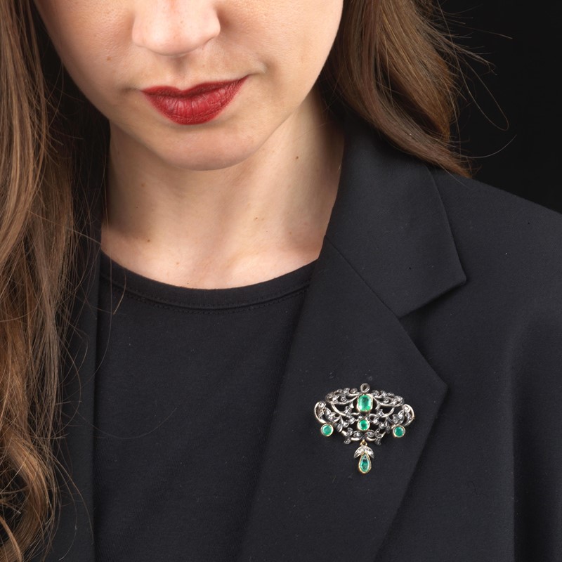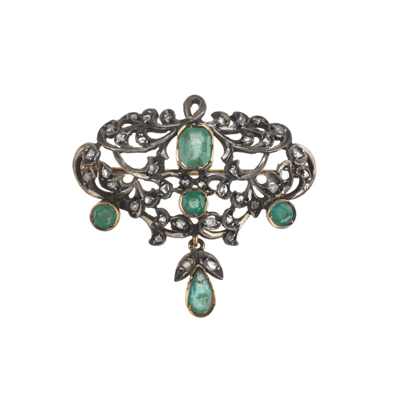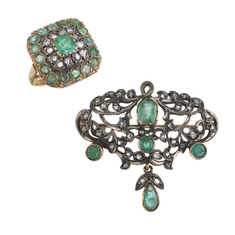 SPILLA E ANELLO CON SMERALDI E DIAMANTI in oro e argento, anello impreziosito da smeraldi taglio rotondo e rose di diamante per ct 0.80 circa, al centro uno smeraldo taglio ottagonale di ct 0.40 circa, mis. 52, accompagnato da una spilla a tralci con smeraldi taglio rotondo e fantasia per ct 1.40 circa e rose di diamante, dim. cm 4x3,5, gr. 14 complessivi
