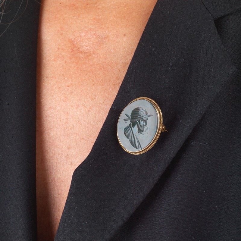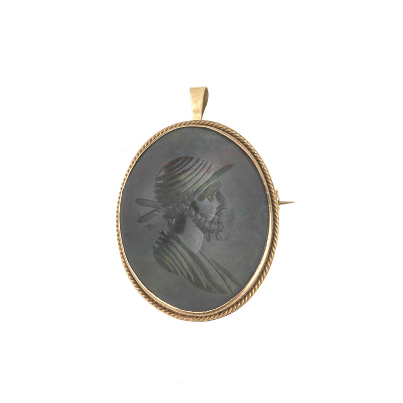 composta da cammeo in diaspro sanguigno raffigurante un profilo maschile inciso entro cornice con passante in oro 18kt, dim. cm 2,5x3,5 circa, gr. 5