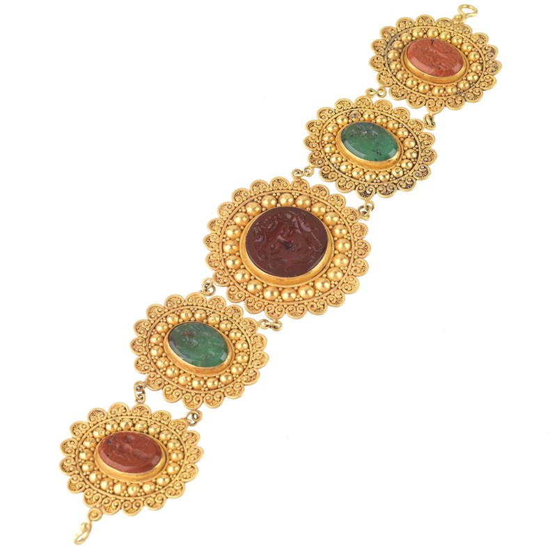 BRACCIALE STILE ARCHEOLOGICO CON PIETRE DURE in oro giallo 18kt, composto da una serie di maglie piatte circolari, lavorate con la tecnica della granulazione e recanti al centro pietre dure incise e figurate, lungh. cm 20, gr. 82